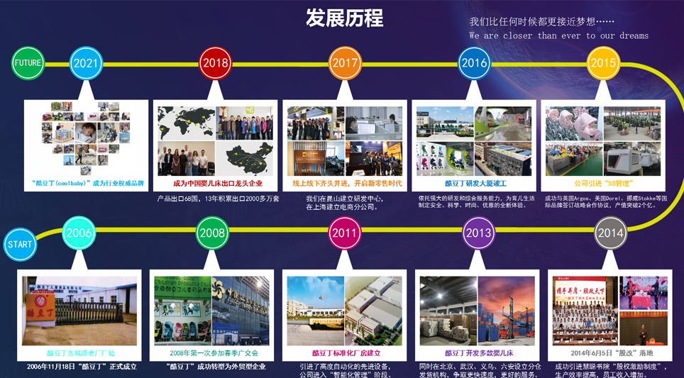 作為中國嬰兒床出口龍頭企業(yè),我們的產(chǎn)品暢銷海外68個國家,累計銷售超過2000多萬張。自公司成立以來,設(shè)計和研發(fā)一直是我們企業(yè)戰(zhàn)略的核心組成部分。我們整合了強大的設(shè)計團隊,組建了經(jīng)驗豐富的管理團隊以及技術(shù)團隊,引進了高度自動化的先進設(shè)備,榮獲了國家“高新技術(shù)企業(yè)”稱號,取得了近百余項專利。為世界提供更好的母嬰產(chǎn)品一直是我們的追求目標(biāo),酷豆丁期待和您一起合作、一起成長、一起夢想。
