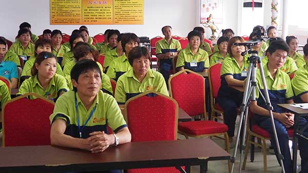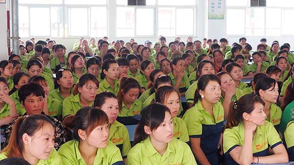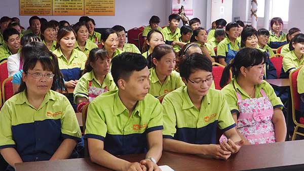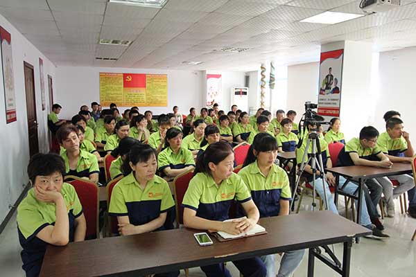縫紉車(chē)間班長(zhǎng)王成對(duì)本車(chē)間200名縫紉工進(jìn)行質(zhì)品培訓(xùn)