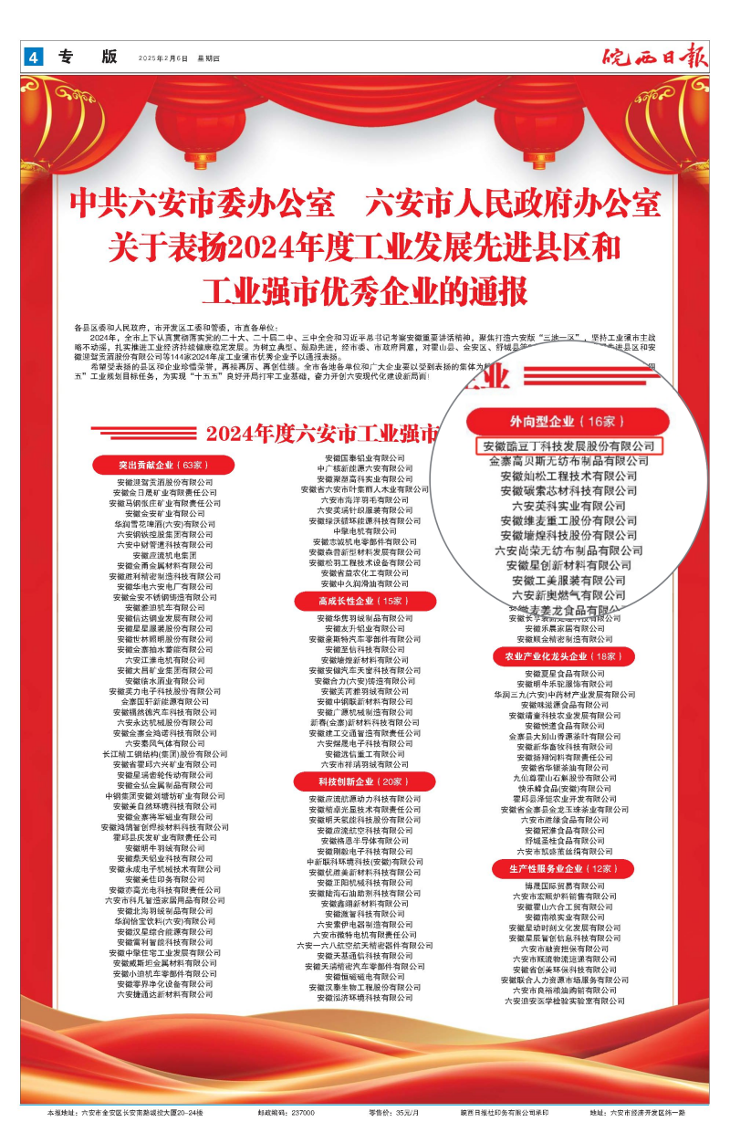 此次榮獲兩項殊榮,是對酷豆丁過去一年成績的充分肯定,更是對公司未來發(fā)展的激勵和鞭策??岫苟⒁源藶槠鯔C,繼續(xù)堅持創(chuàng)新驅動、綠色發(fā)展,做實智能綠色制造,在實現(xiàn)公司高質(zhì)量發(fā)展的同時,積極履行社會責任,為六安工業(yè)強市和工業(yè)發(fā)展貢獻更多力量,譜寫更加輝煌的新篇章!