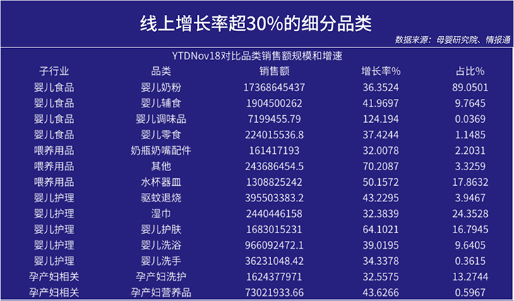 第四,細分為王,大而全、小而美同時并存。母嬰子行業(yè)規(guī)模在不斷擴大,很多細分品類增長率是非常高的,其中線上增長超過30%的細分品類非常多,如奶粉、輔食、奶瓶、濕巾等。