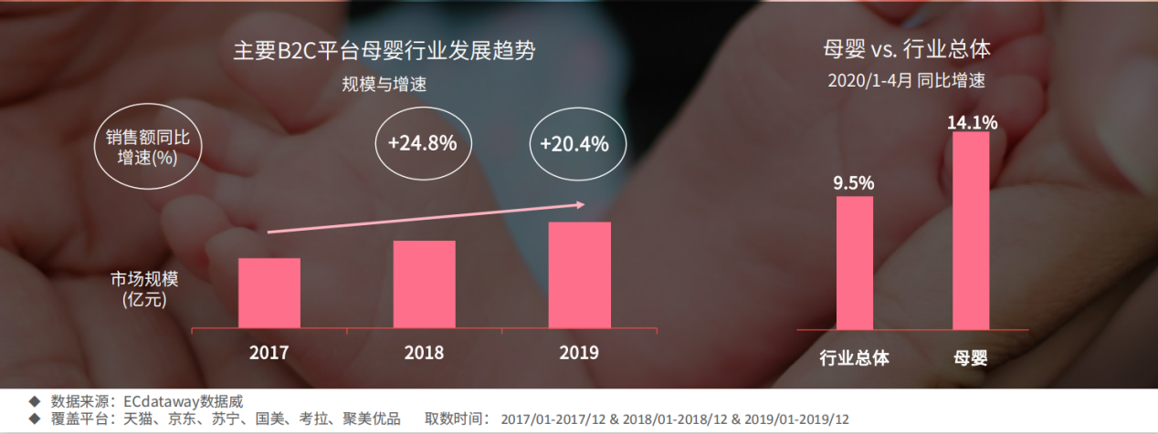 其次,母嬰行業(yè)B2C市場,最近三年保持穩(wěn)定增長。母嬰行業(yè)B2C市場2019年以20.4%的增長率保持穩(wěn)步的增長態(tài)勢,雖然相較于2018年增速下滑了4.4%,但依然領(lǐng)先于行業(yè)17.7%的平均增速。在疫情期間(2020年1-4月),行業(yè)總體同比增速是9.5%,母嬰電商銷售同比增速是14.1%,總的來說,母嬰電商的增速和發(fā)展趨勢還是優(yōu)于行業(yè)整體的。