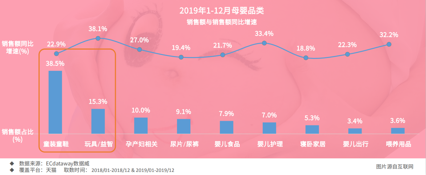 從細(xì)分品類來看,2019年母嬰品類中童裝童鞋規(guī)模最大,占銷售額近40%;其次是玩具益智類,同比增速最快,達(dá)38.1%;童鞋童鞋品類同比增速雖然低一點,只有22.9%,但也高于尿布、寢臥家居、嬰兒出行等這些品類。所以相對來說童裝和玩具/益智類目整體表現(xiàn)更好一些,尤其是玩具/益智類目最近幾年的增速一直都比較快。