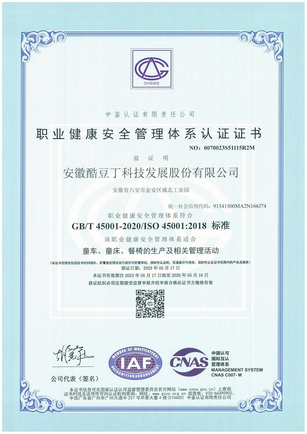 職業(yè)健康安全管理體系認(rèn)證證書