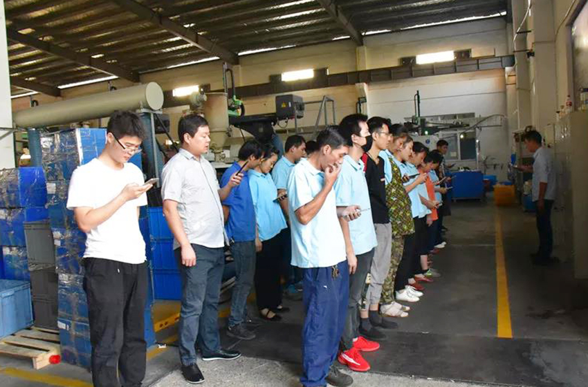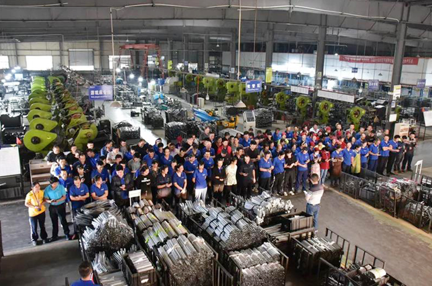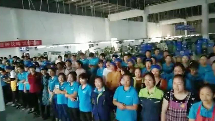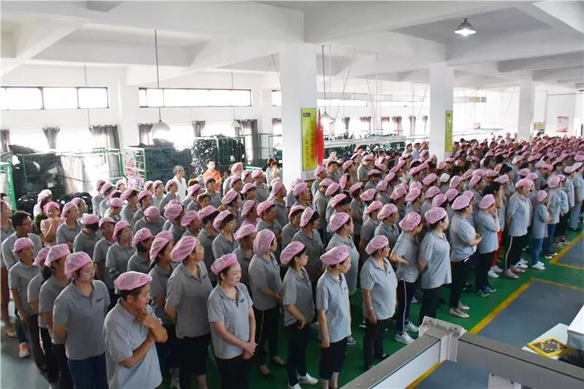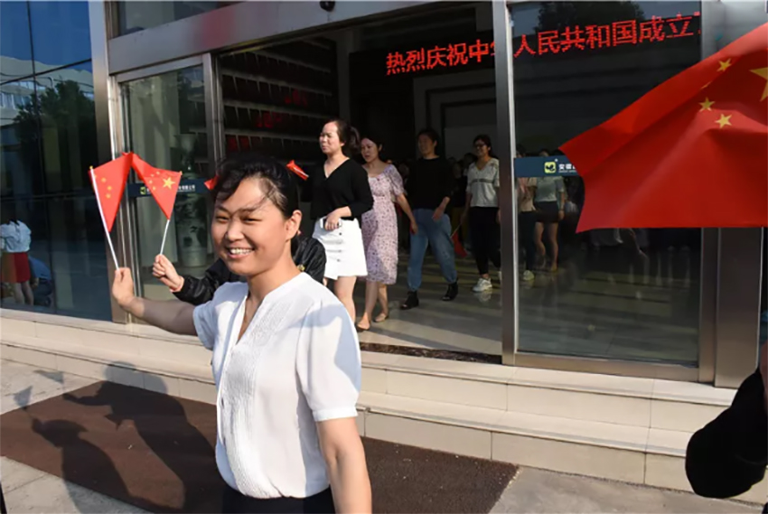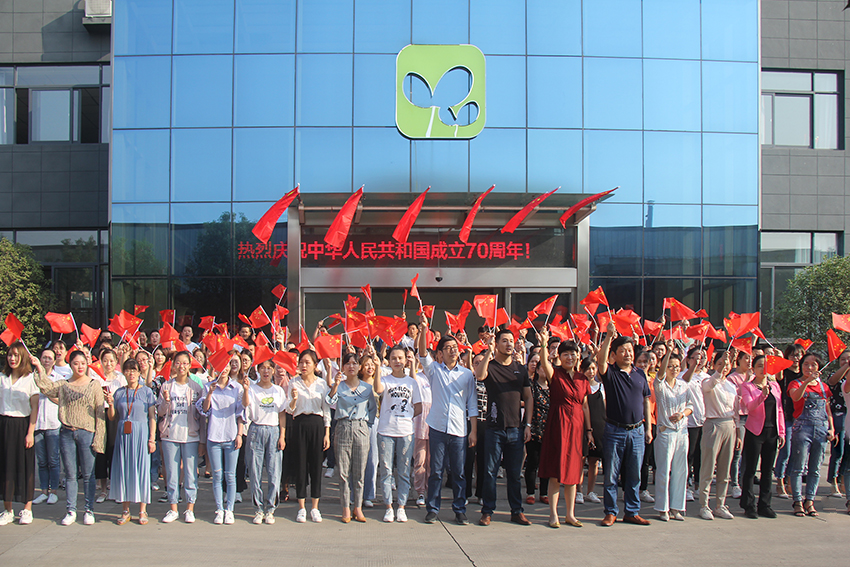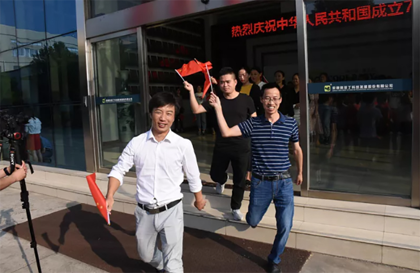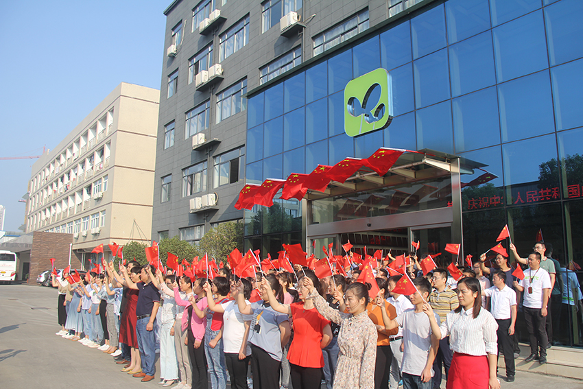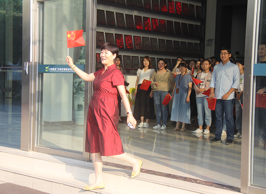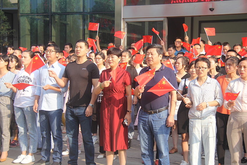 董事長張迎年帶領員工們舉旗高呼“我愛我的祖國”“我愛我的公司”“我愛我的家”