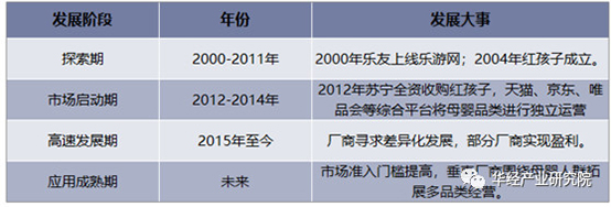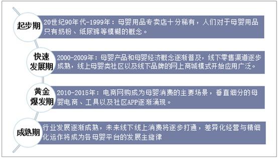 中國母嬰行業(yè)發(fā)展經(jīng)歷了四個(gè)階段,分別是起步期、快速發(fā)展期、黃金爆發(fā)期及成熟期。當(dāng)前母嬰行業(yè)發(fā)展逐漸成熟,未來線下線上消費(fèi)將逐步打通,差異化經(jīng)營與精細(xì)化運(yùn)作將成為各母嬰平臺的發(fā)展主旋律。