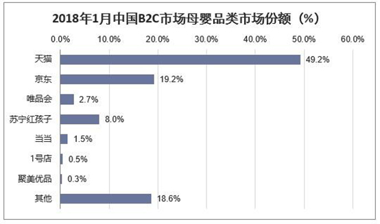 從平臺格局來看,天貓、京東等綜合電商平臺占據(jù)主要市場份額,2018年1月合計(jì)占比68.40%。垂直母嬰電商在SKU、用戶流量上雖然拼不過綜合電商,但是它們可以用較少但是精選的SKU縮短消費(fèi)者的決策時(shí)間,解決選擇困難癥的問題,而且因?yàn)榇怪蹦笅腚娚炭蛻羧后w的集中性,向線上社區(qū)、育兒記錄工具服務(wù)切入也更為專業(yè)和容易,因此在與強(qiáng)勢的綜合電商的競爭過程中,依然能用差異化的產(chǎn)品和服務(wù)占據(jù)一定的市場份額。