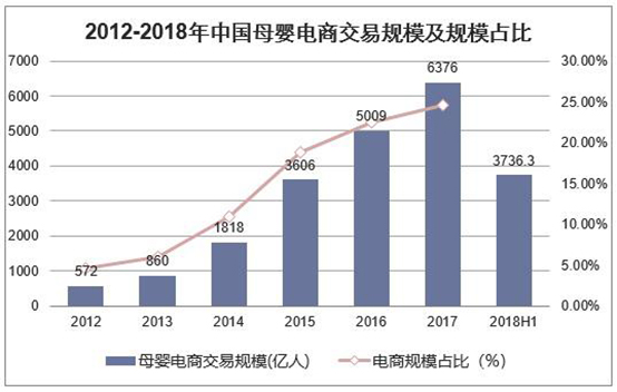 在需求拉動(dòng),多平臺布局及資本加持的促進(jìn)下,中國母嬰電商市場規(guī)??焖僭黾?。2018年上半年,母嬰店電商平臺隅田川、海拍客、海帶、PatPat和babytree紛紛獲得較大規(guī)模的融資,為平臺的發(fā)展提供了資本支持,同時(shí)推動(dòng)了中國整體母嬰電商業(yè)的發(fā)展。2012-2017年,中國母嬰電商產(chǎn)品交易規(guī)模大幅增加,由2012年的572億元上升至2017年的6376億元,年均復(fù)合增長率為61.97%,規(guī)模增幅較快。至2018年上半年全國母嬰電商高交易規(guī)模為3736.3億元。